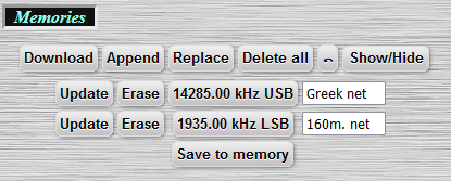 Press Save to Memory so to store a frequency. Frequencies are stored as a cocky, so if you clean them from browser then the memories will be deleted. To avoid deleting your memories, you can store them and download them locally. Then you can upload them every time you wish to do so, or move them to another WebSDR, which uses the same function.
